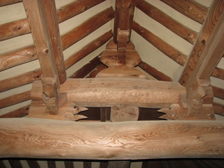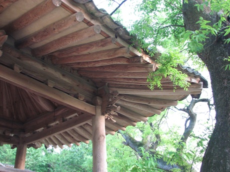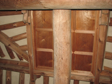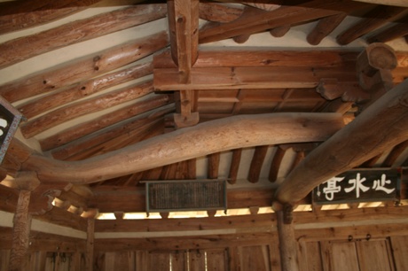 심수정의 눈썹(외기)천장 모습과 독특한 모양의 대들보결구...