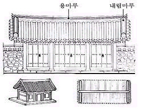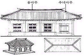 가장 아름다운 구성미를 지닌 지붕으로 곡면이 특이하여 부석사 무량수전, 통도사 불이문 등이 있다 |