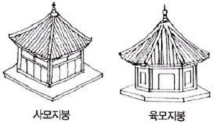 사모지붕은 현존하는 사찰 건축에서는 보기 어려운 구조로 불국사 관음전, 창덕궁 연경당의 농수전 등이 있다. 육모지붕은 평면이 육각으로 된 지붕으로 경복궁 향원정이 있다. 팔모지붕은 평면이 팔각으로 된 지붕으로 통도사 대웅전이 있다. 십자형 지붕은 전주 송광사범종루,비원부응정이 있다. |