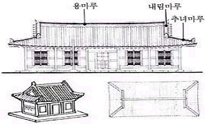 현존하는 권위건물의 지붕형태 중에서 가장 많은 형태의 지붕으로 용마루와 내림마루 추녀마루가 모두 갖추어진 가장 화려하고 장식적인 지붕이다